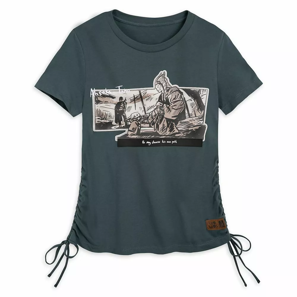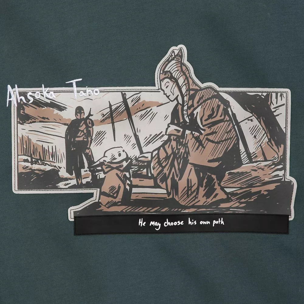 ”He may choose his own path.” This Ahsoka Tano tee captures the pivotal moment when she and Grogu meet. With the Mandalorian standing in the background, the unforgettable scene is depicted on this fashion tee in gorgeous artwork. Extra-special details include cinched drawstring sides, embroidered lettering and an embossed faux leather tag. Inspired by Star Wars: The Mandalorian, it is a beautiful way to remember the moment always.