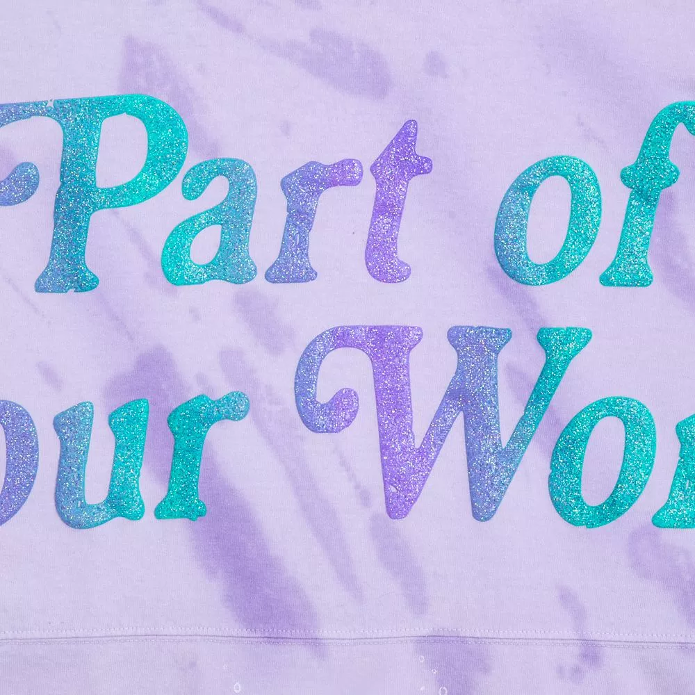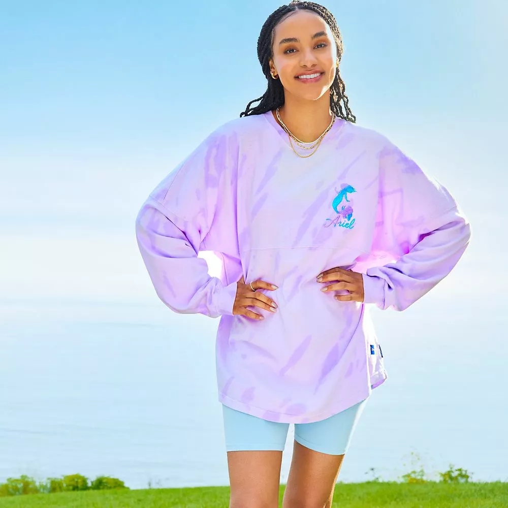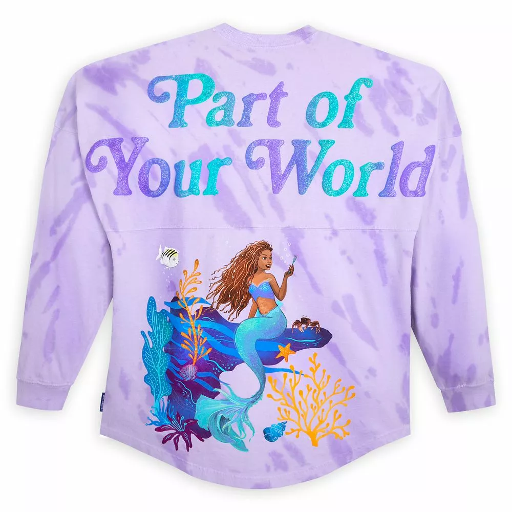 Rise from the sea to greet your destiny in this dreamy pullover Spirit Jersey with allover ”undersea” dye effect, Ariel art and glittering ”Part of Your World” text inspired by Disney’s live action film, The Little Mermaid.