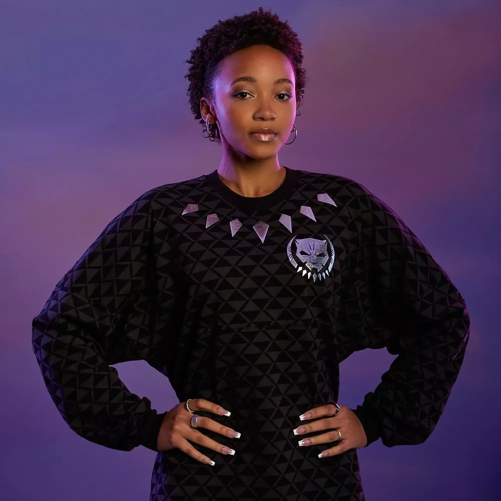 Inspired by the legendary Panther Habit, this Black Panther: Wakanda Forever Spirit Jersey certainly looks and feels good enough to be habit forming. Featuring iconic screen art and bold lettering printed in dramatic silver foil puff ink, it has classic Spirit Jersey styling matched with super hero attitude. It gives fresh new meaning to the word power dressing.