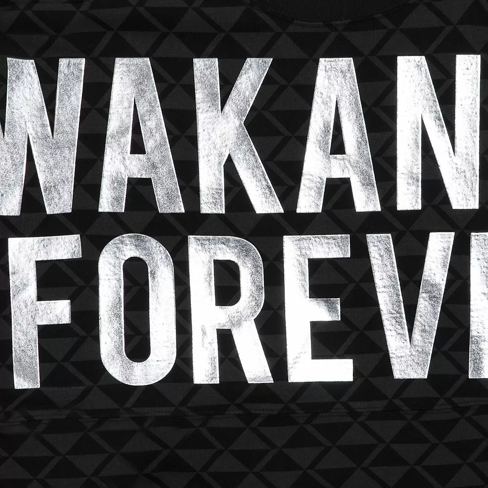 - ”Wakanda Forever” silver foil screen text in puff ink