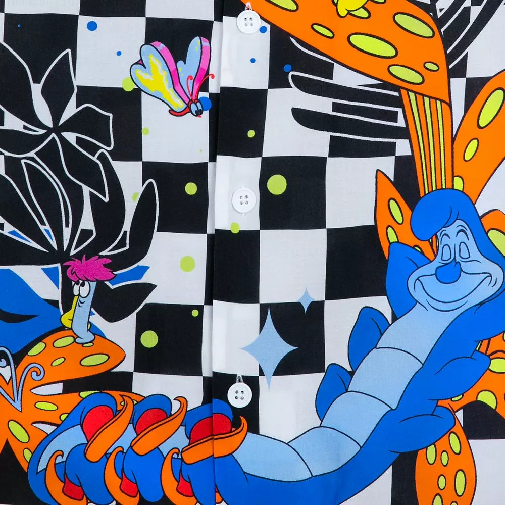 Who R U to resist this woven button up shirt featuring a brilliant colored Caterpilllar against a checkerboard pattern? The laid back character from Walt Disney’s animated Alice in Wonderland is joined by some of his equally vibrant friends on this bold top. Take our advice–once cocooned inside, the transformation will greatly improve your style. Now recite!