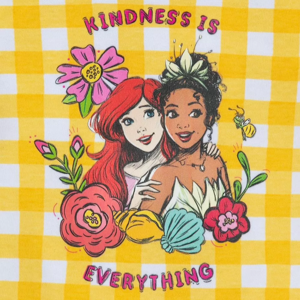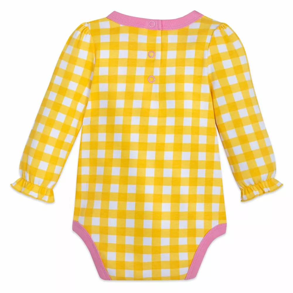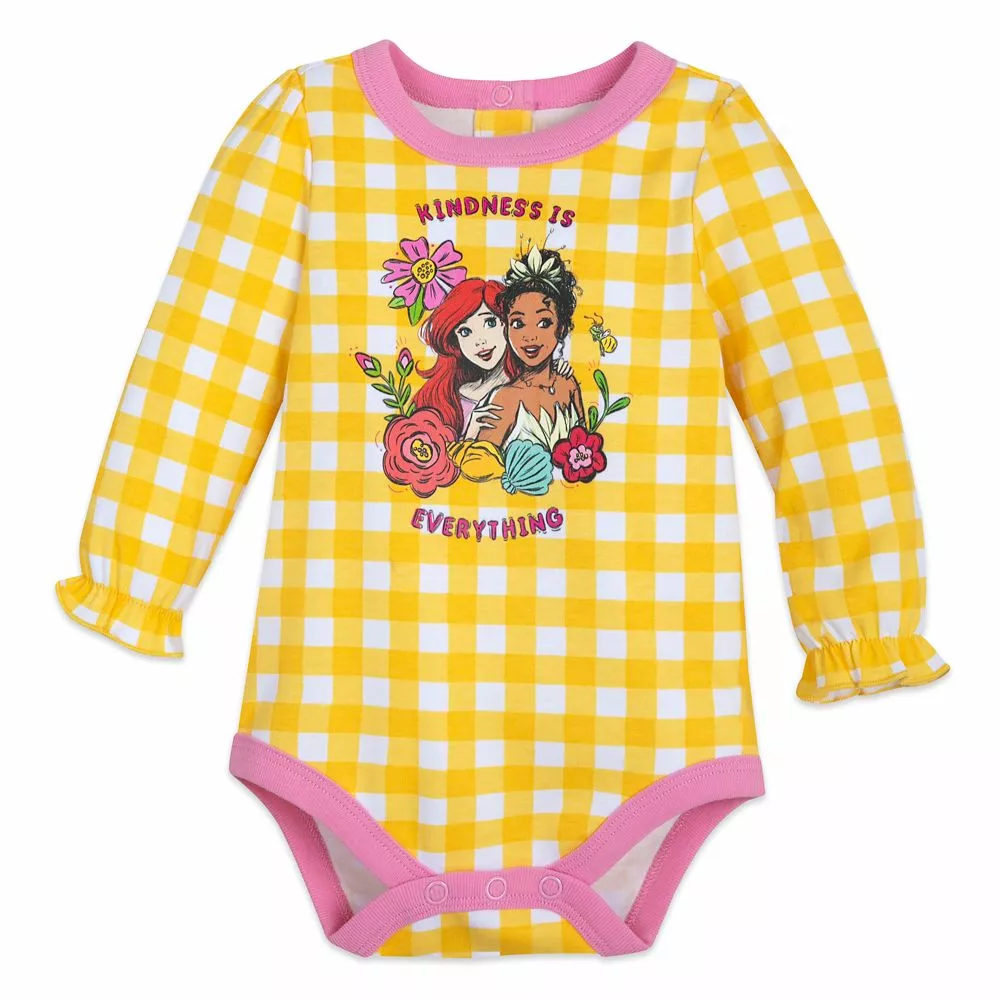 Baby couldn’t wish for anything sweeter than this Disney Princess bodysuit that reminds us ”Kindness is everything.” Ariel and Tiana are pictured on the front of this cotton outfit featuring a yellow checkered pattern with long puff sleeves and contrasting pink trim.