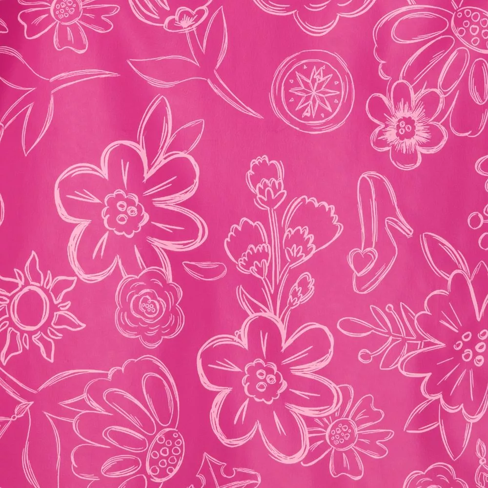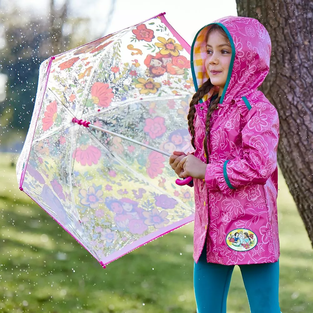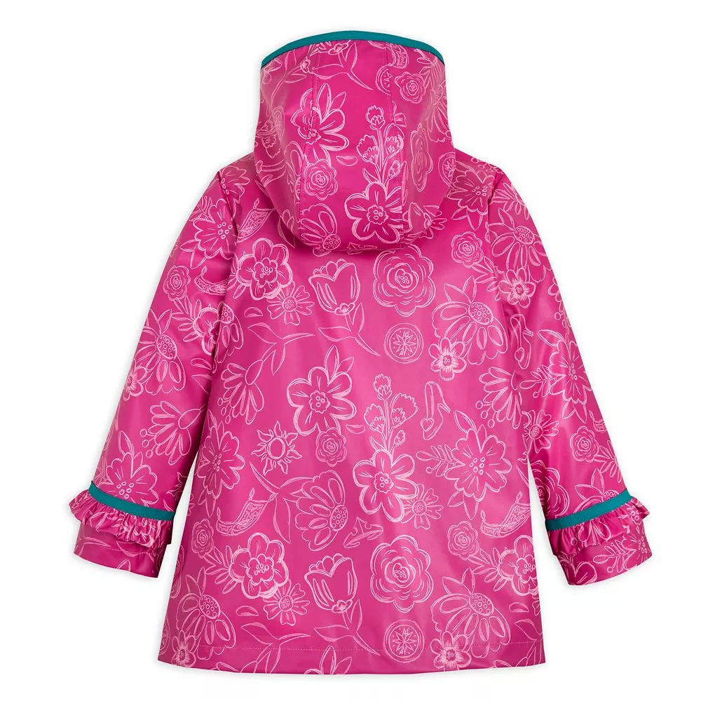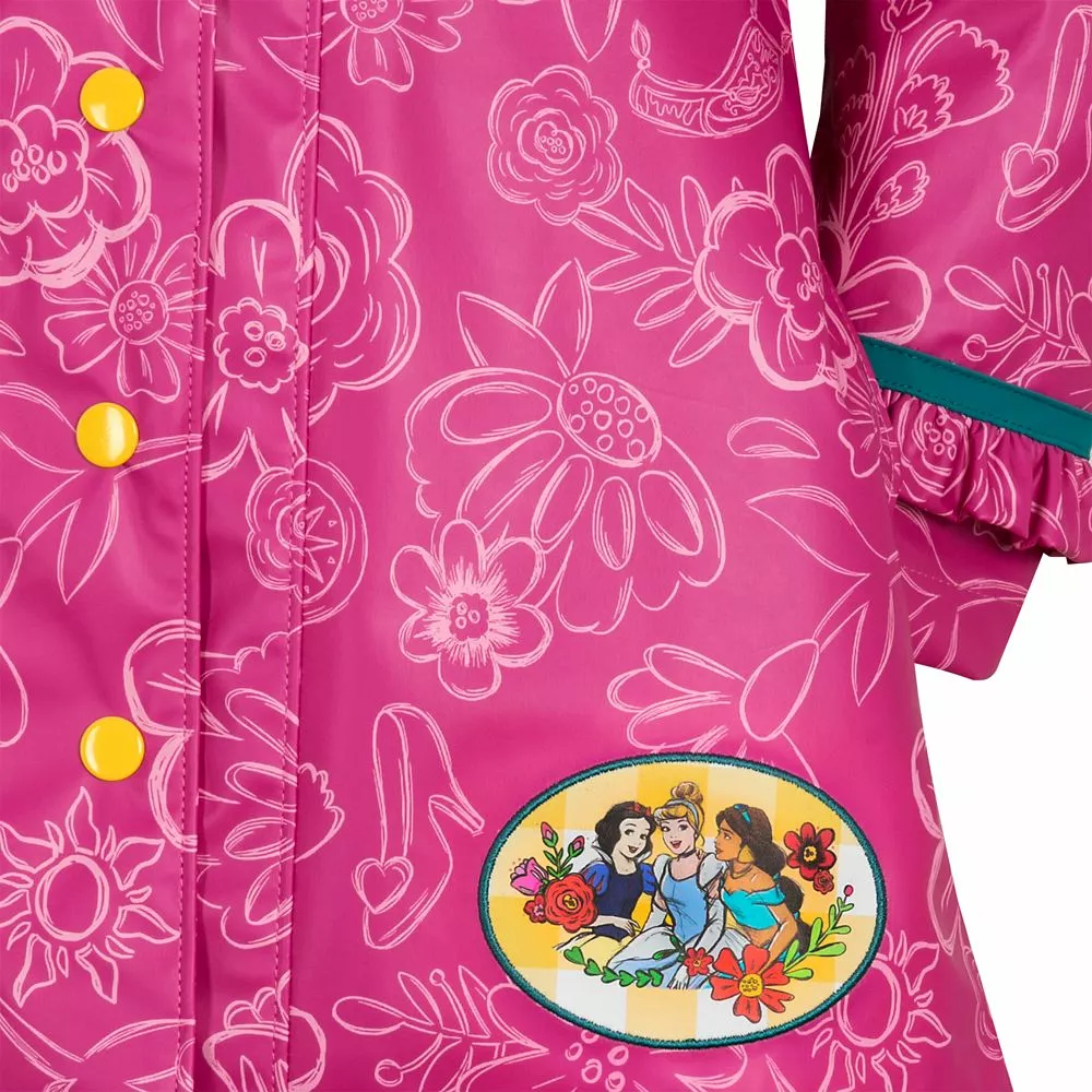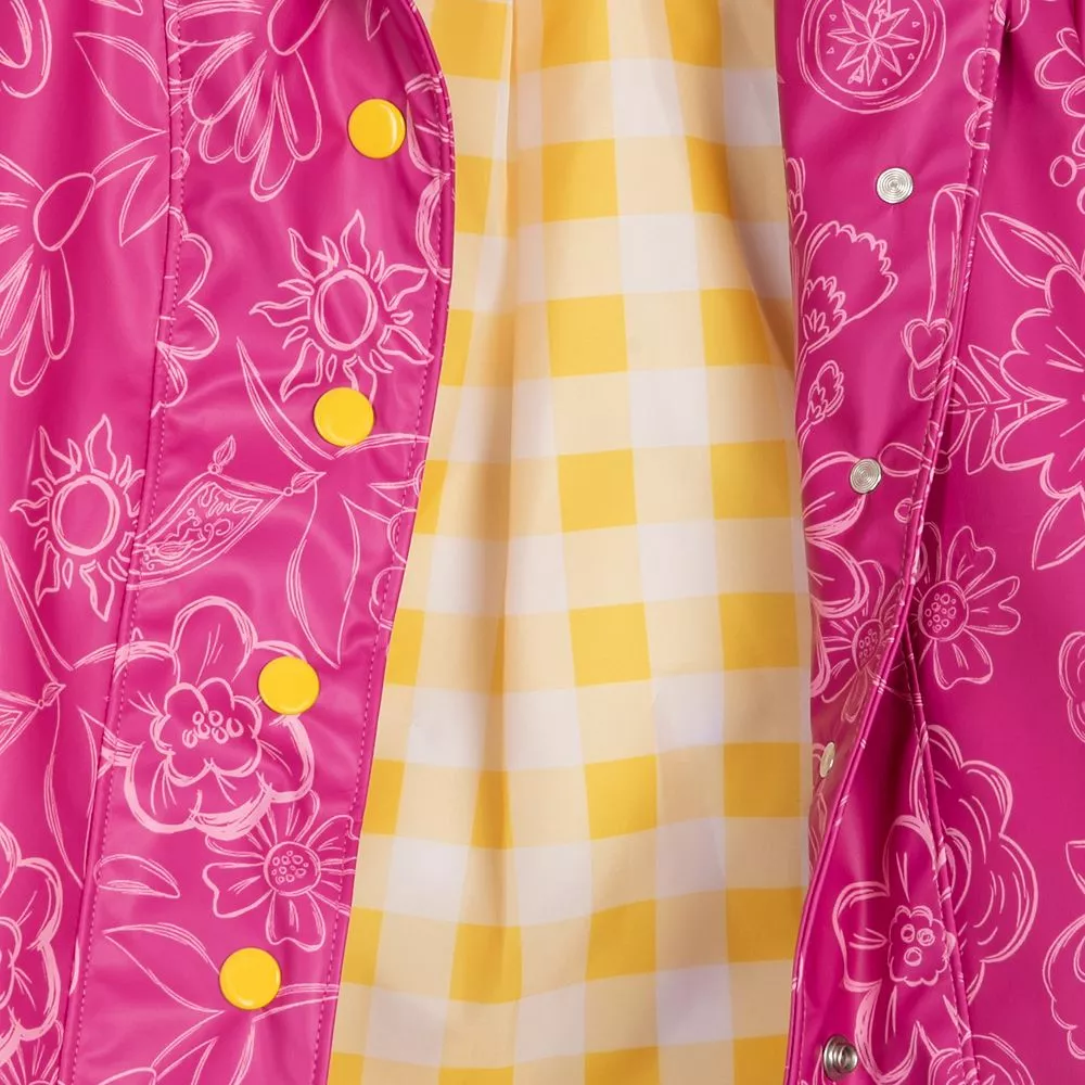 Gray skies are a little sunnier with this Disney Princess rain jacket. Pretty in pink with an allover floral and glass slipper print, it’s accented with a patch appliqué featuring art of Snow White, Cinderella and Jasmine. A lovely mix of sensible and fanciful, this water resistant jacket has a hood and full snap front plus a sunny yellow checkered lining, contrast trim and ruffles on the cuffs.