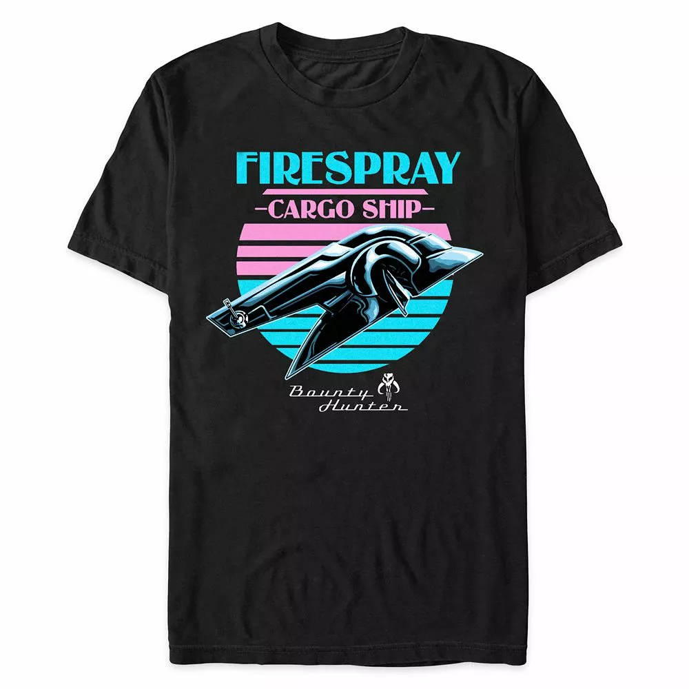 Take off for adventure in this soft cotton t-shirt featuring Firespray Cargo Ship art and text along with a Mythosaur skull emblem. Inspired by the Disney+ show Star Wars: The Book of Boba Fett.