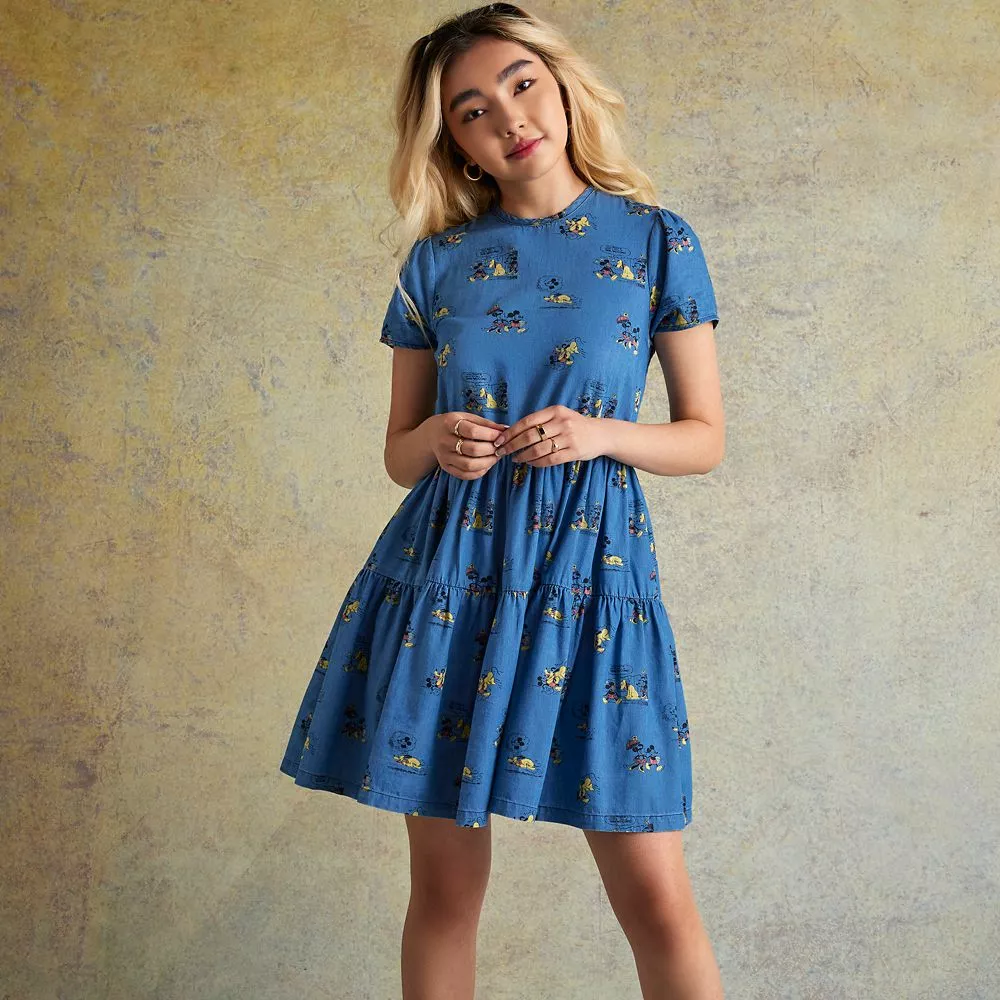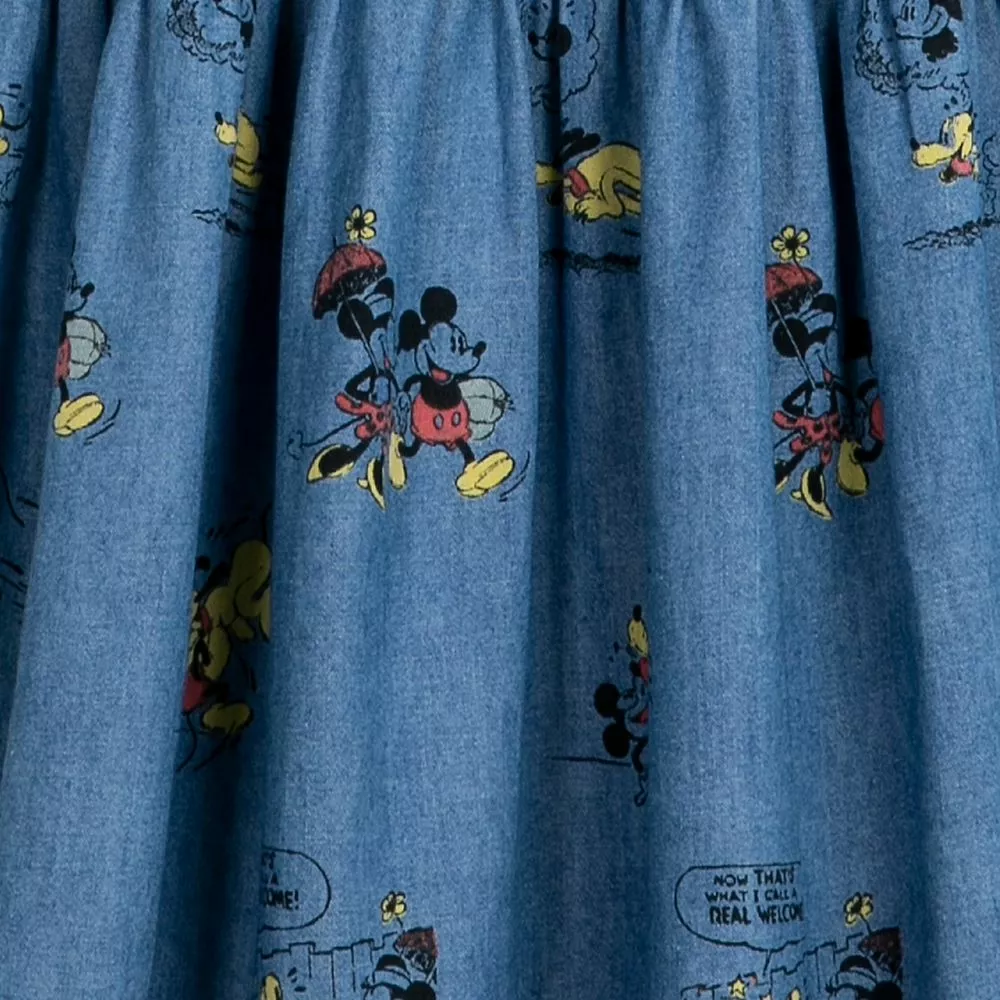 Weekends were made for this Mickey and Friends chambray dress. In fact, this cute and comfy soft cotton dress can make any day feel extra special. The vintage style allover print of Mickey Mouse, Minnie and Pluto adds a fresh and fun touch. Pretty details like the tiered skirt, cap sleeves and keyhole back make dressing up as easy as being with friends.