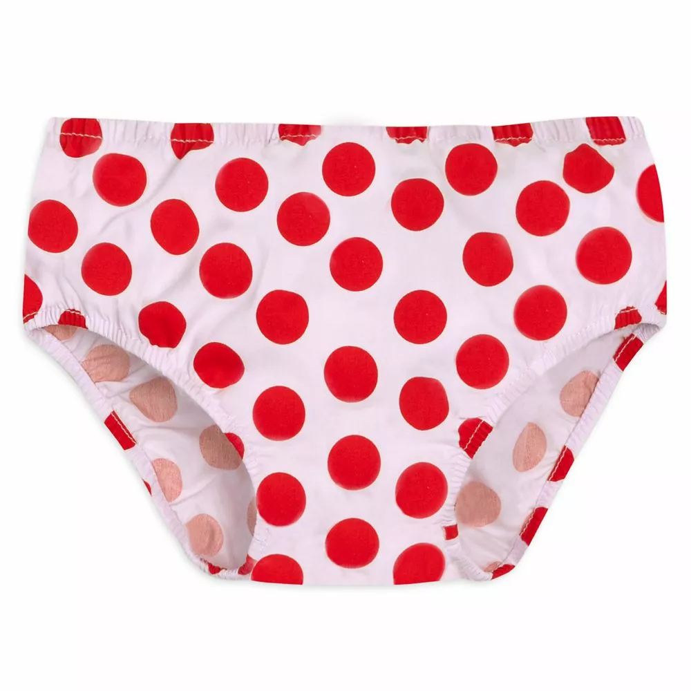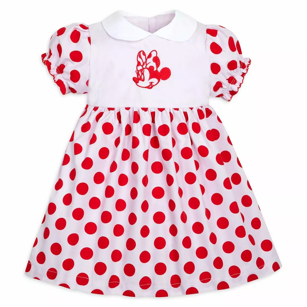 A sweet little outfit that brings on big smiles, this Minnie Mouse dress is festooned with red polka dots. A red embroidered appliqué of Minnie takes center stage. A classic ”Peter Pan” collar, puff sleeves and matching bloomers complete this adorable look that is sure to make a big impression.