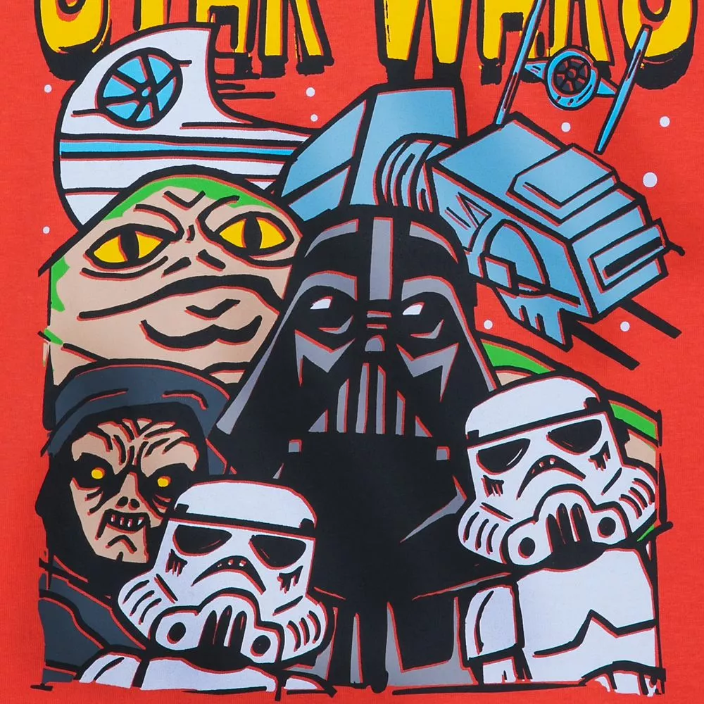 They can join the bright side when wearing this bold orange Star Wars t-shirt featuring a fun illustration. Darth Vader, Jabba the Hutt and Darth Sidious are among the characters pictured along with some TIE starfighters and an AT-AT.