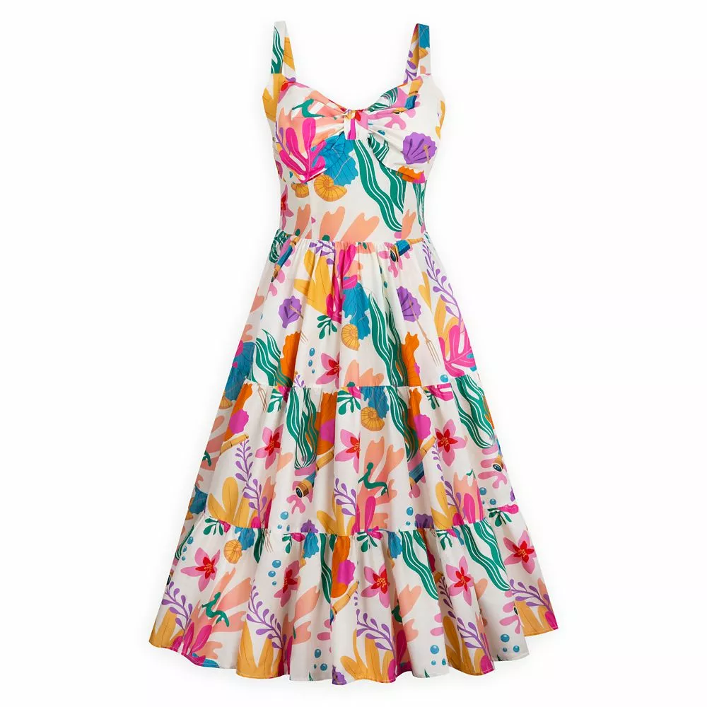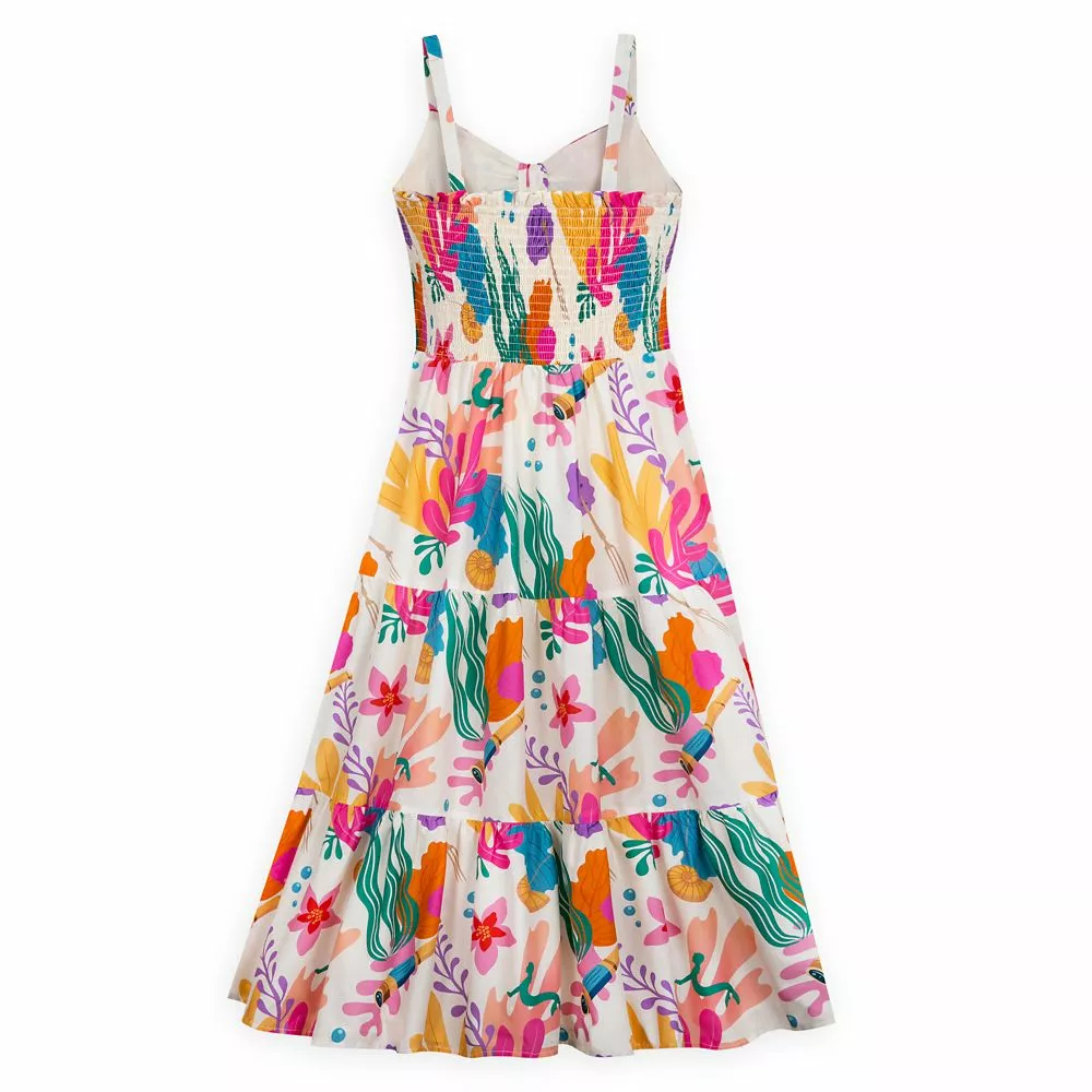 Bring a splash of color to spring and summertime with this bold and bright dress inspired by Disney’s live action The Little Mermaid. The allover aquatic print features signature items from the movie like a spyglass, dinglehopper and the figurine Prince Eric gives to Ariel. The sleeveless cotton design includes a large bow on the bodice and a pieced skirt so you’ll ride the next fashion wave in style!