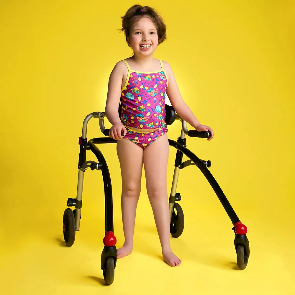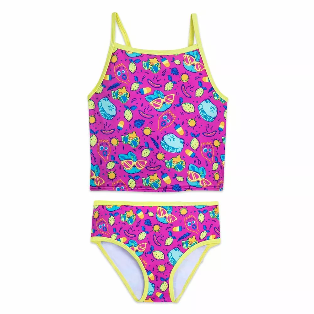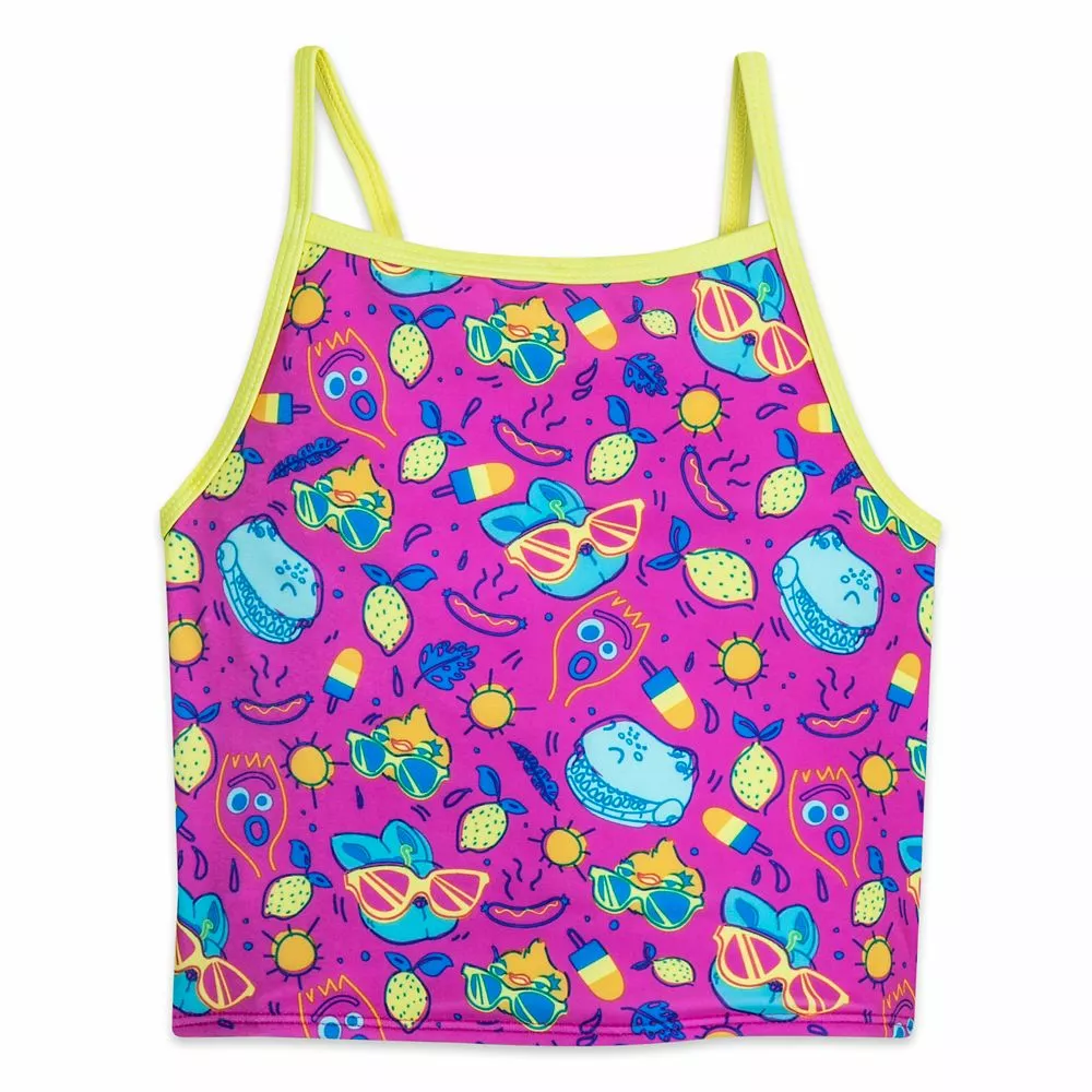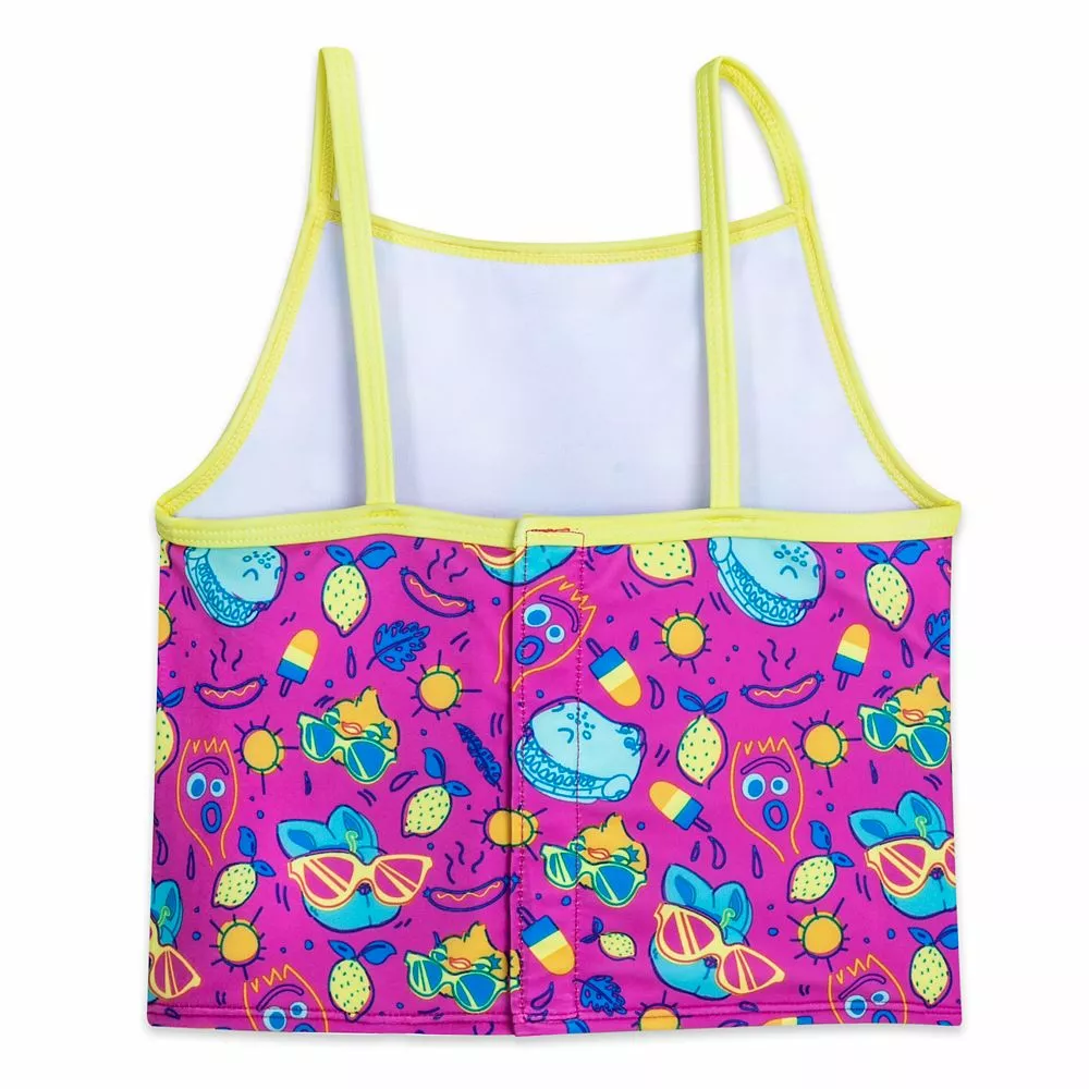 This two-piece adaptive Toy Story swimsuit look good enough to eat. Popsicles, hotdogs and lemons are included in the deliciously colorful allover print that has a few familiar faces like Ducky and Bunny. The top and bottoms feature self-stick fabric tabs for ease of use.