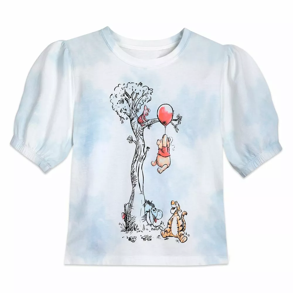 Take a rest in your thoughtful spot while wearing this whimsical fashion tee with puffed sleeves, semi-cropped hem and art featuring Winnie the Pooh and his pals in the Hundred Acre Wood.